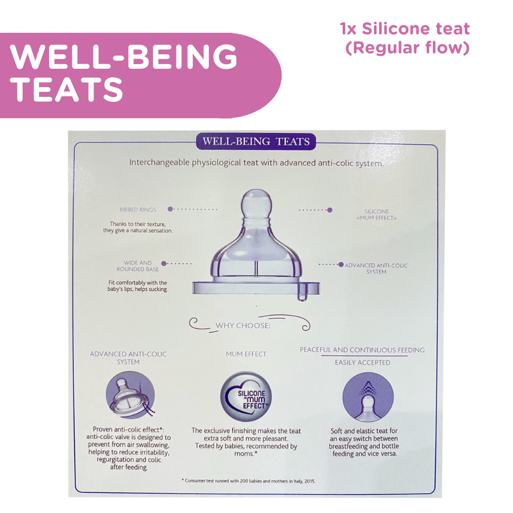 * 1x Silicone Teat (Regular Flow): The teat features an anti-colic valve at the base, making it compatible with Well-Being bottles. This innovative design prevents teat collapse and minimizes air intake, effectively reducing the risk of colic and regurgitation. With smooth and relaxed feeding, your baby can enjoy mealtime without discomfort.