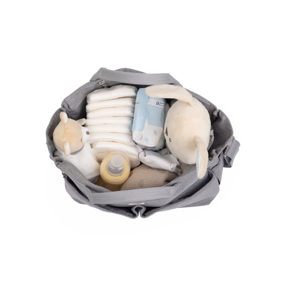 Crafted in a chic, neutral Lunar Rock (Grey) color, the bag features a durable fabric and a versatile design that easily transitions from a tote to a shoulder bag. The spacious main compartment holds everything from diapers and bottles to extra clothes and toys, as shown in the internal view.